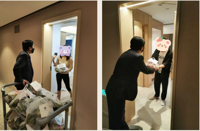 面对住户买不到菜的困境,公寓第一时间联系所在长风街道协调物资,及时调配了300份蔬菜礼包,由工作人员消毒、打包、再用小推车一户户送入住户手中。